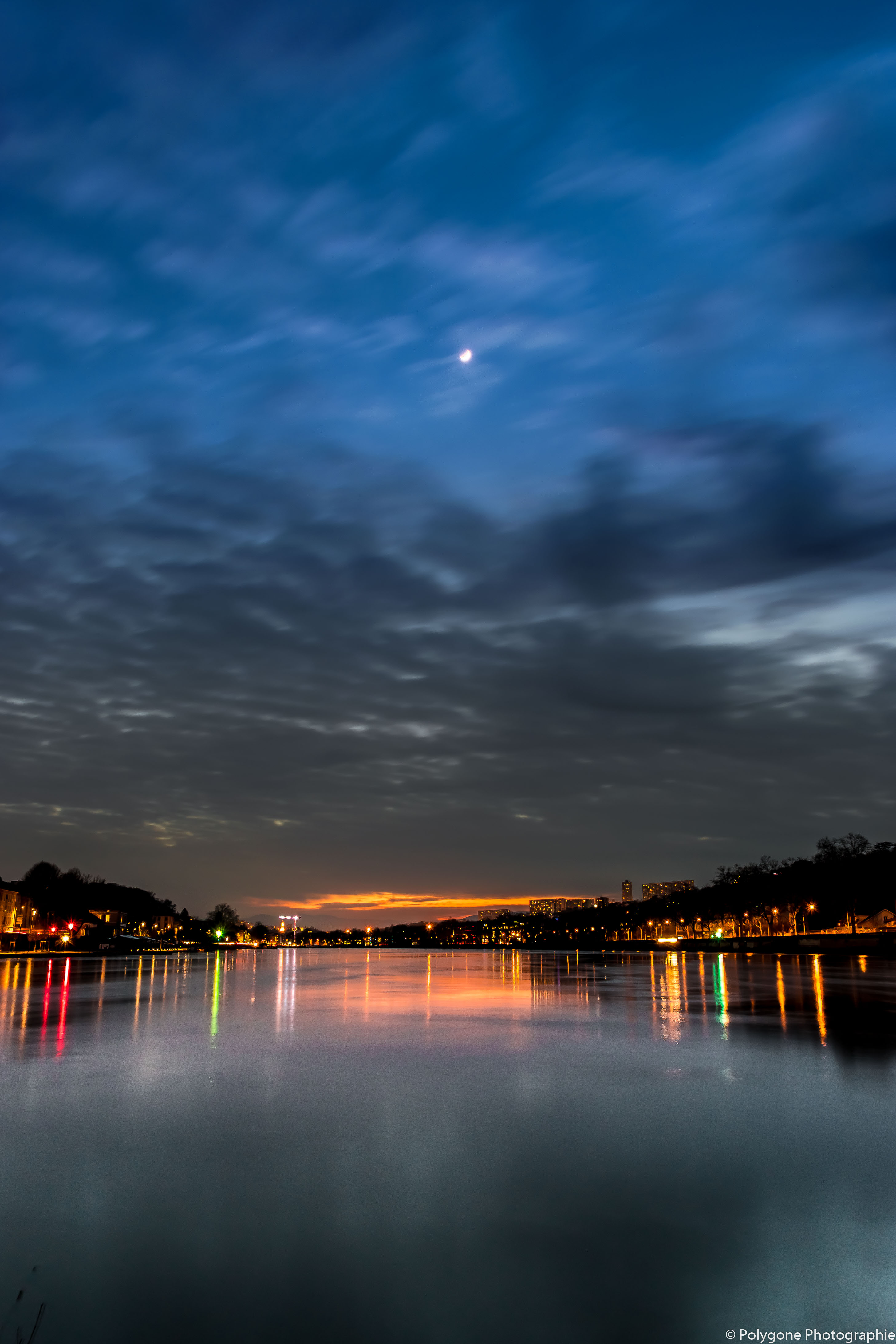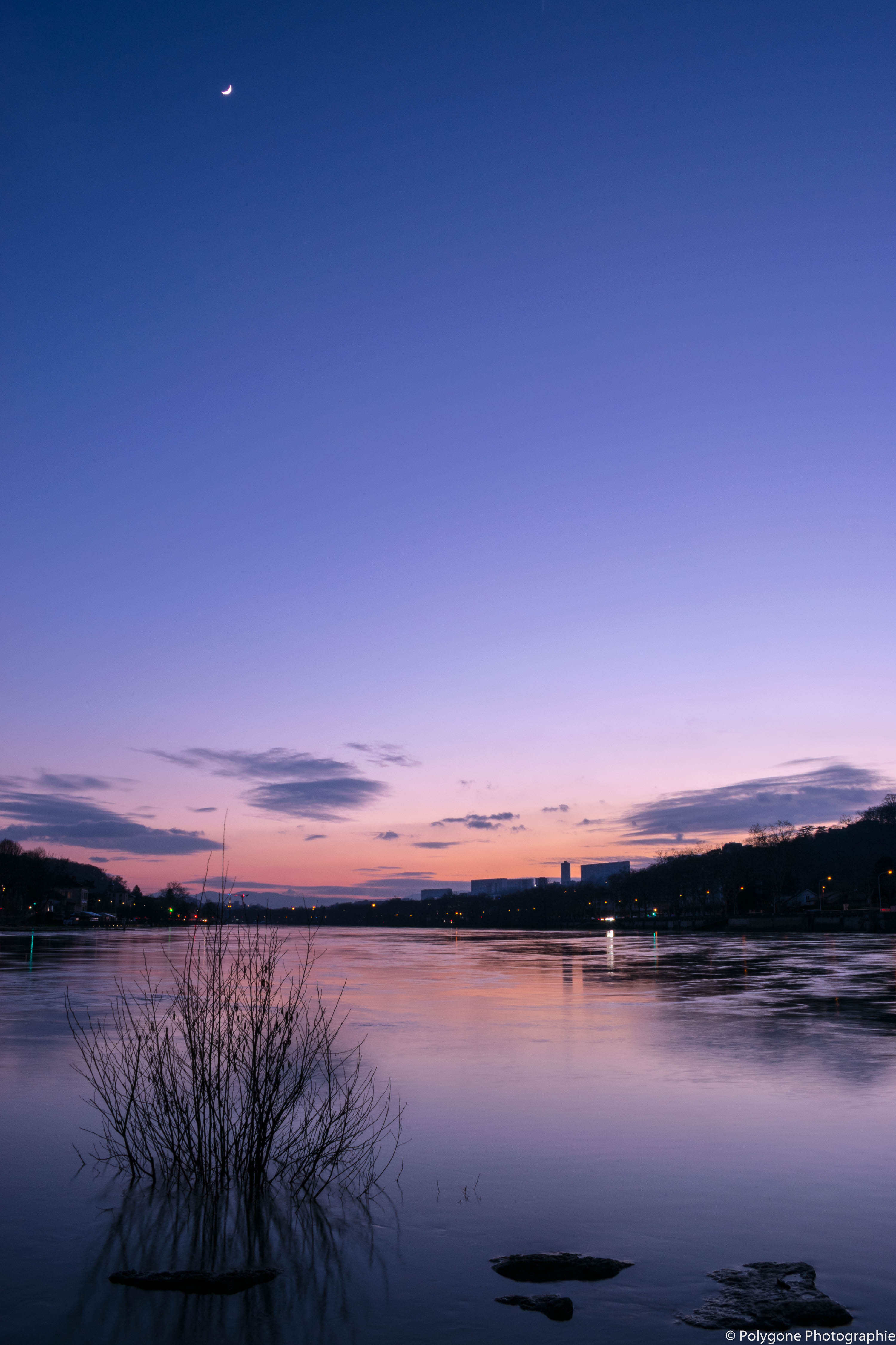 Fin du coucher de soleil par ciel dégagé à l'Ile Barbe. Cette photographie fut prise durant la crue de 2018 à Lyon. Nous pouvons voir un petit croissant de lune dans le ciel, tandis que le rose du ciel se reflète dans l'eau.