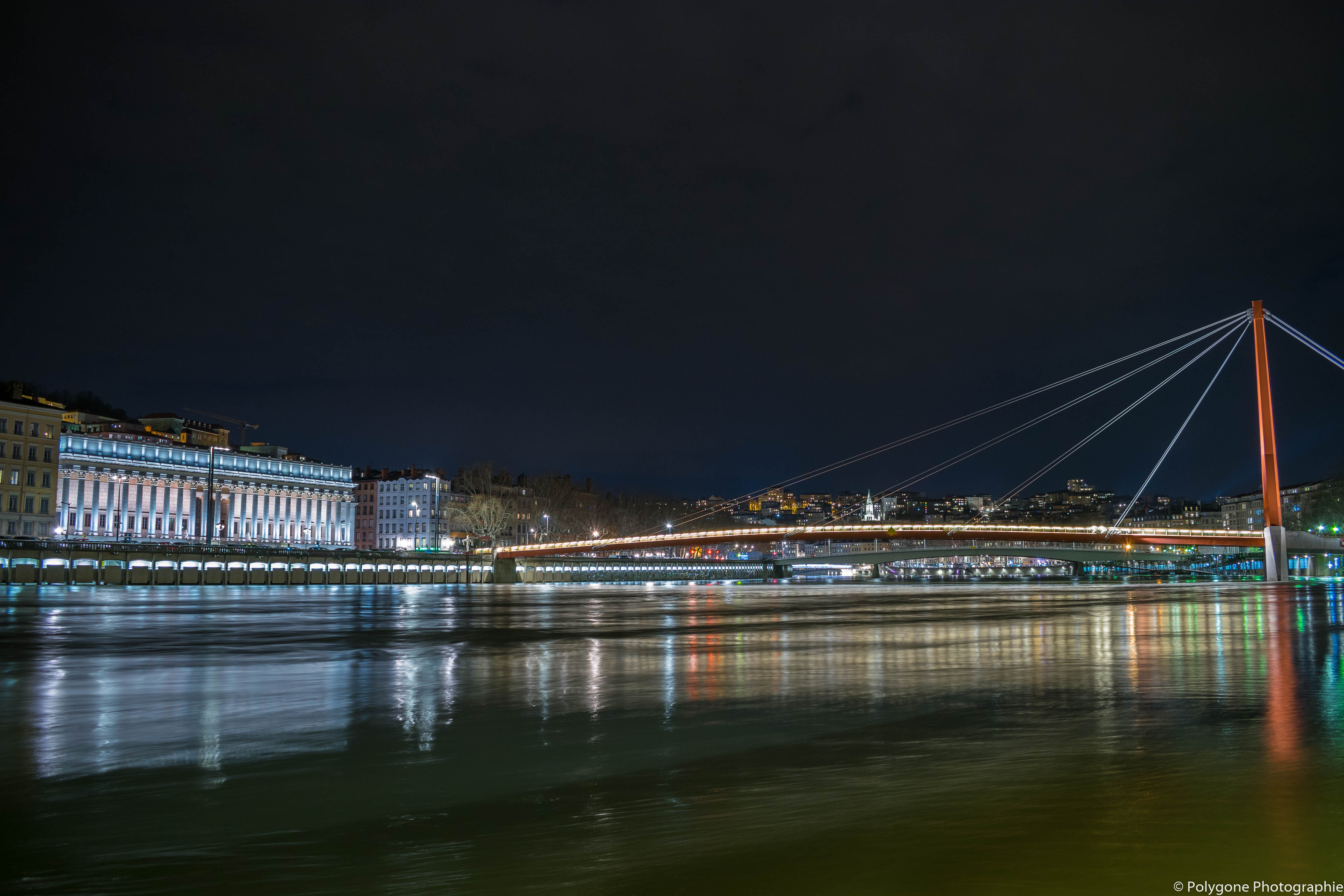 Reflet de la passerelle du Palais-de-Justice sur la Saône.La rivière est haute et on la voit s'introduire dans le parking sous le Palais.La nuit très sombre permet d'obtenir une très belle lumière.