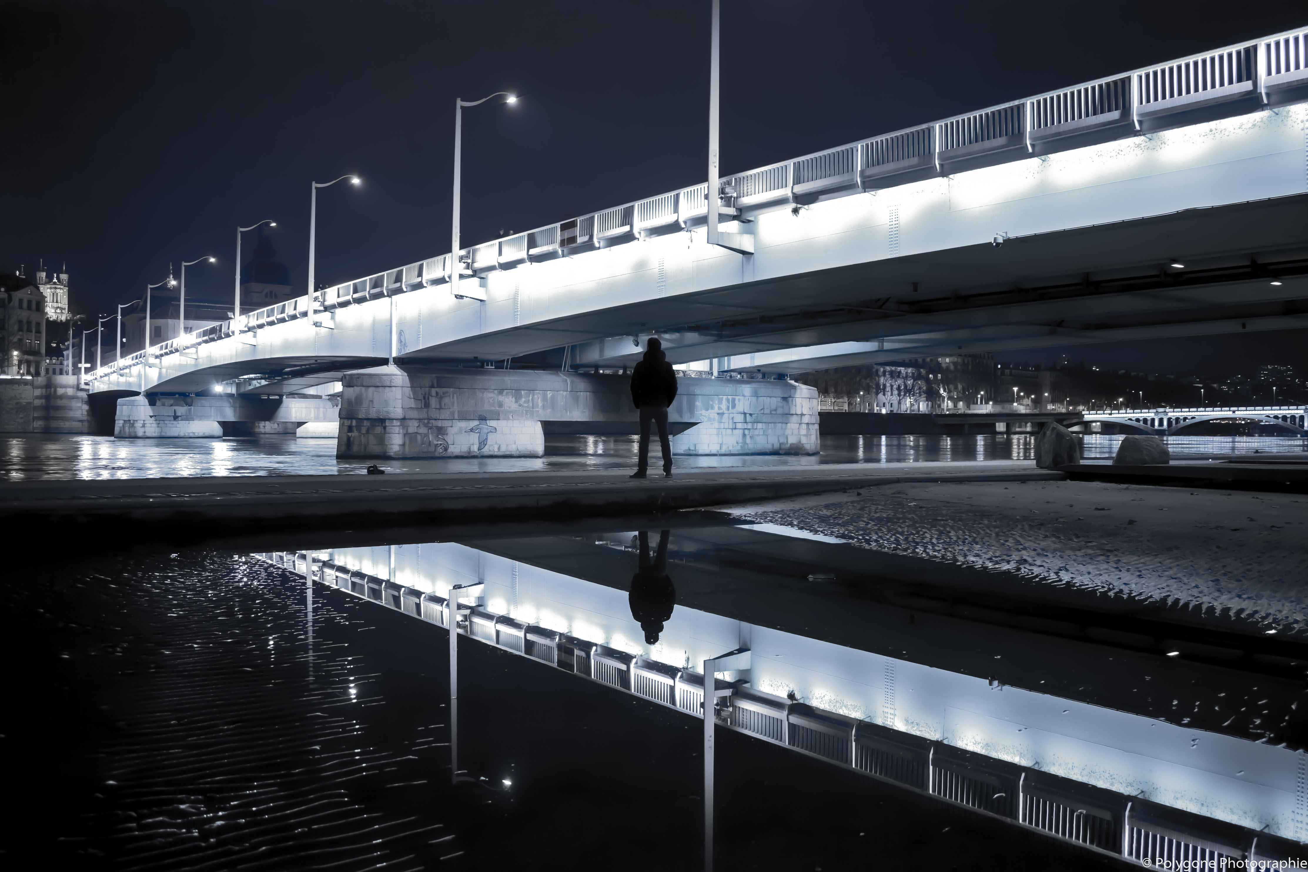 Reste de la crue 2018 à la Fosse aux Ours à Lyon.Ici la photographie est travaillée en noir et blanc bleuté.La taille de la flaque permet de jouer sur de larges reflets.