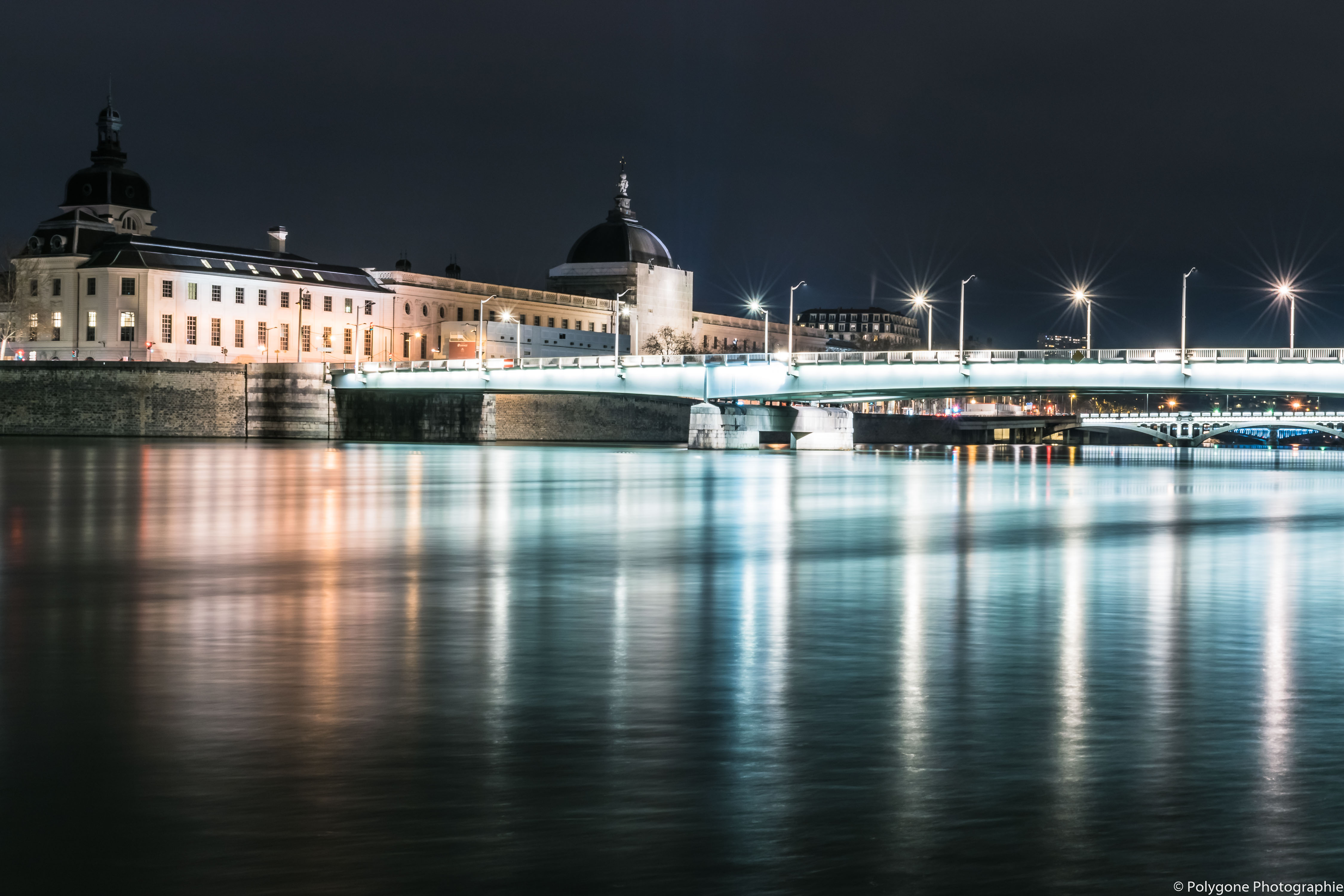 Vue du Grand Hôtel-Dieu sur les berges du Rhône de nuit à Lyon.La longue exposition rend le Rhône quasiment lisse, propice aux reflets tout en longueur comme ceux que l'on voit.Enfin les lampadaires nous permettent d'avoir ces stries lumineuses, qui rappellent presque des fusées au lancement.