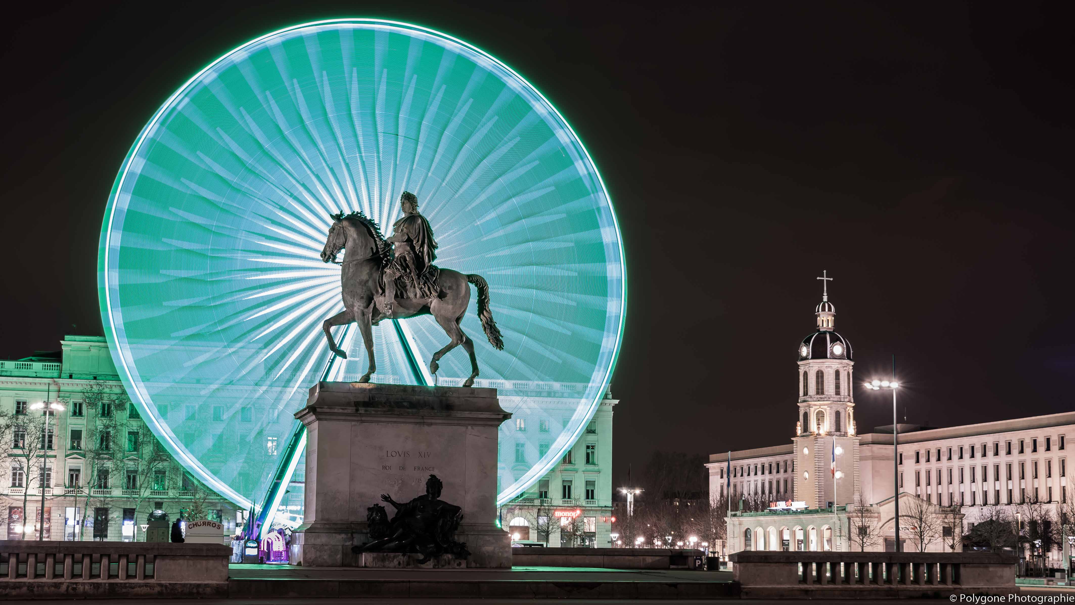 La fameuse Grande Roue de la place Bellecour à Lyon, avec un temps d'exposition de quelques secondes.On distingue ses hayons, avec cette belle couche de lumière turquoise qui harmonise le tout.Au premier plan nous trouvons la statue de Louis XIV, par le sculpteur François-Frédéric Lemot.