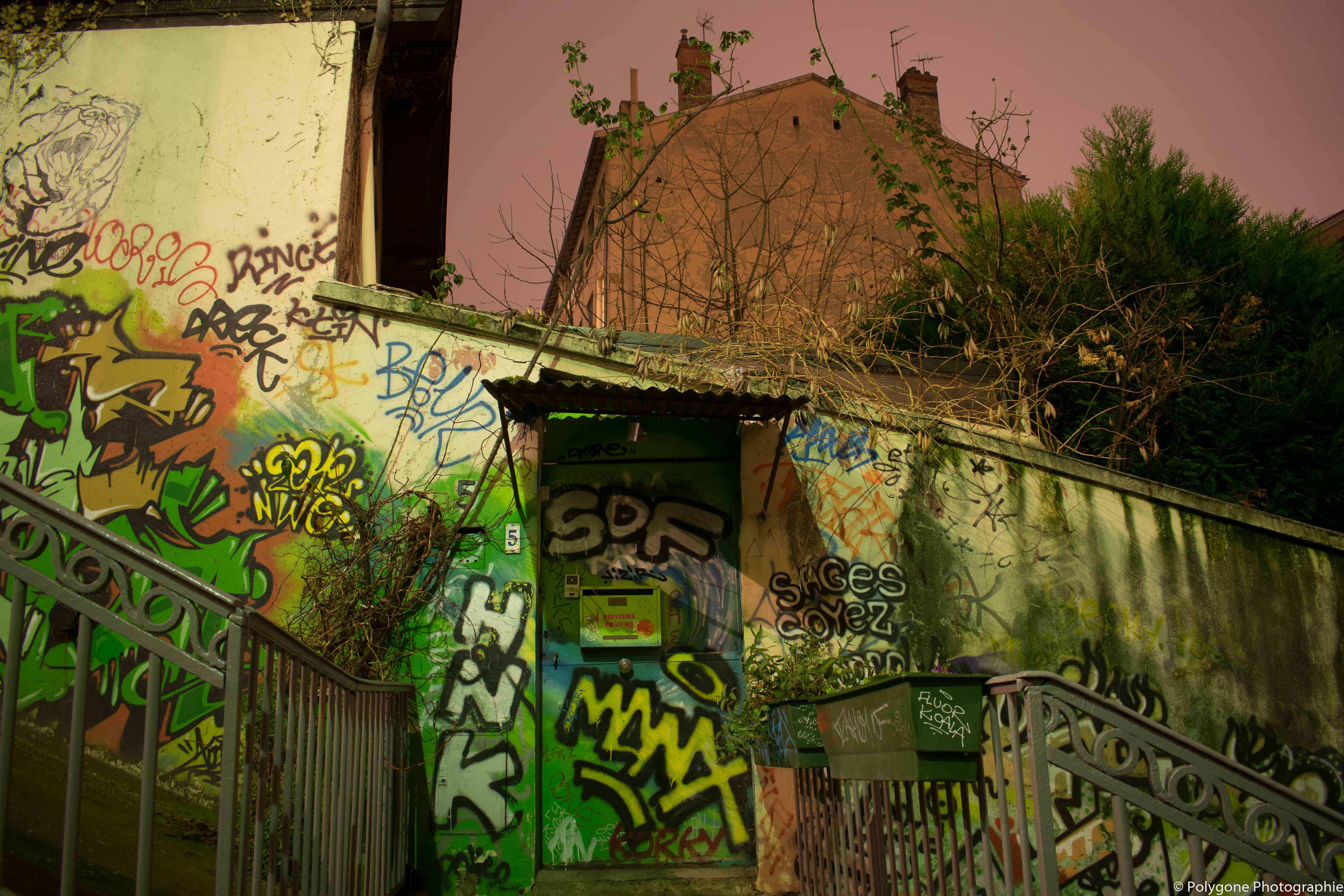 Une porte d'entrée dans les pentes de la Croix-Rousse à Lyon, tout en couleur.Ici le street art y est très présent, et de nombreux artistes investissent les murs pour s'y exprimer.Tags, autocollants, sculptures et même de la mosaïque, Lyon bouillonne de créativité.
