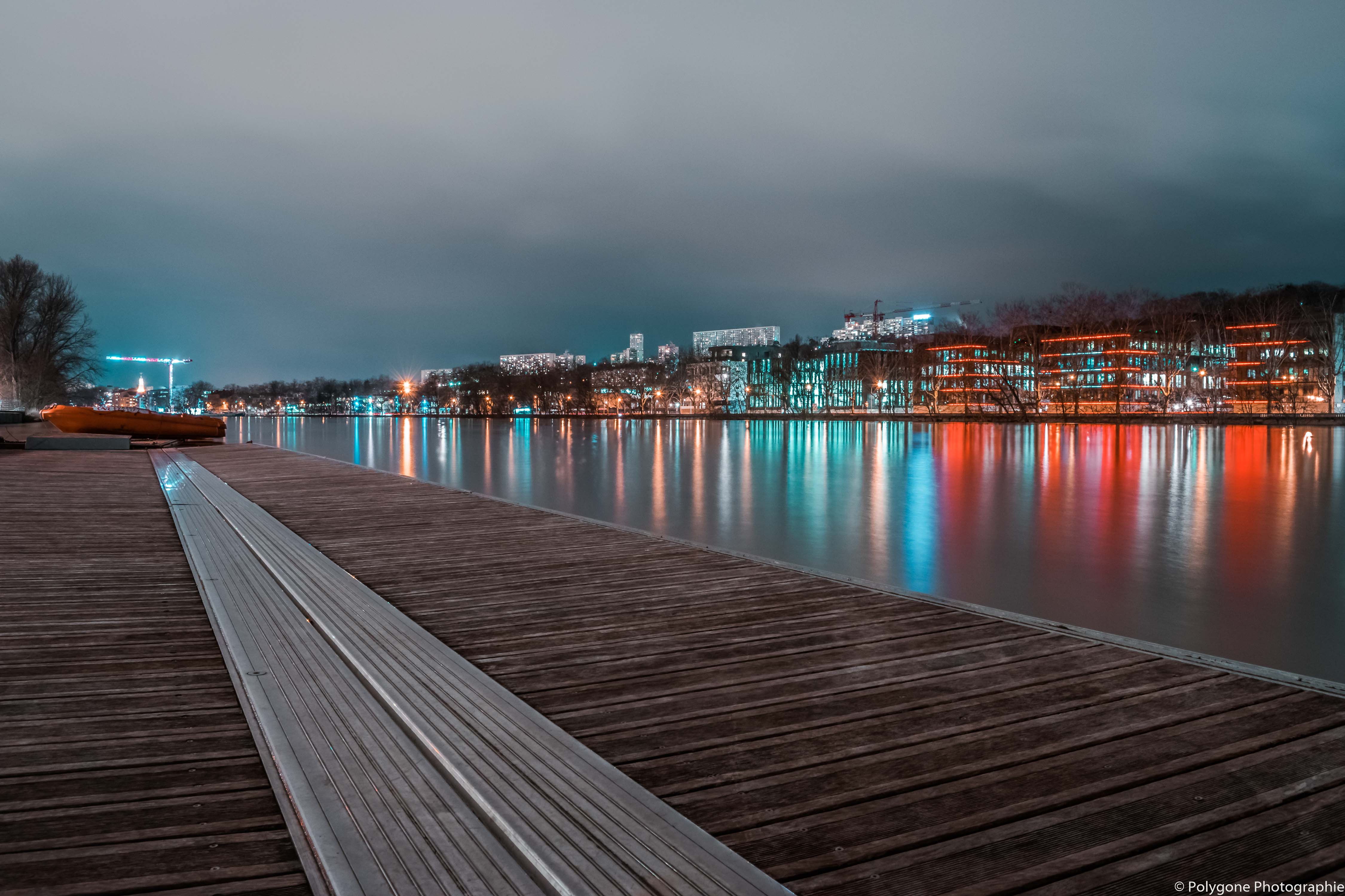 Cette photographie montre les quais de Saône vus du Aviron Union Nautique.Les reflets des lumières dans l'eau et cette ligne de fuite lui donnent beaucoup de vie. On y sent l'agitation et l'effervescence de Lyon.